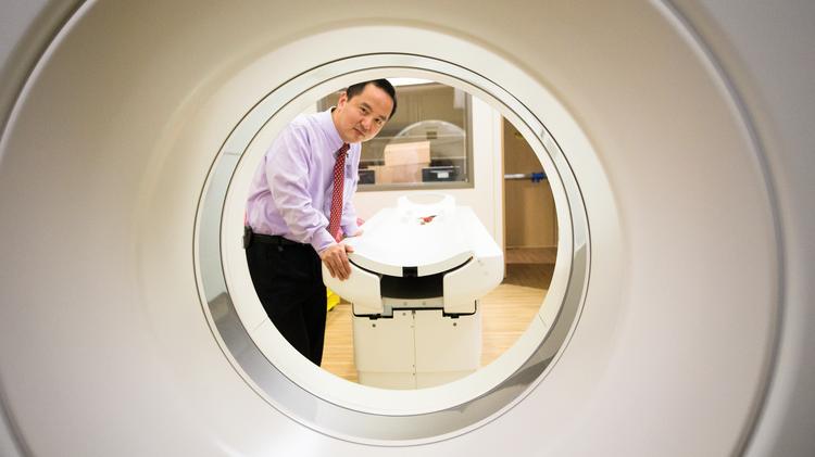 Physicist Dr. Yanle Hu makes final adjustments during the installation of a CT simulator… more